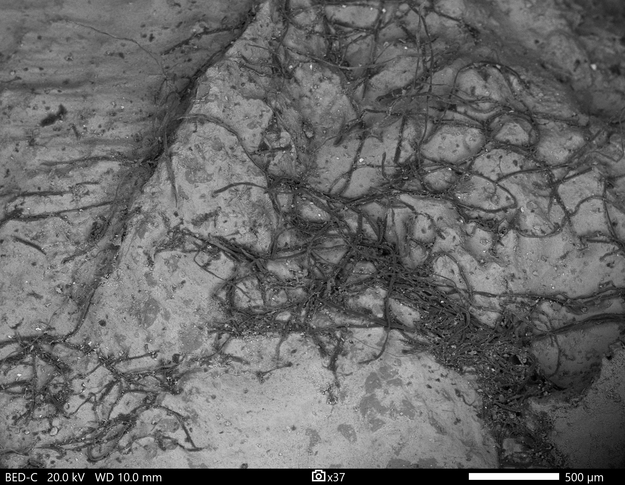 The entry is a backscatter electron image of the exposed internal cortex surface of a 1.4 billion year old Fe-phyllosilicate ooid. The black filaments are exceptionally preserved 3-dimensional fossil acritarchs that were entrained within the cortex of the grain during deposition. The pale grey matrix is interlaminated berthierine and greenalite, the mid grey grains are silica with features suggesting they maybe silicified acritarchs. The latter point is supported by the observation that the organic filaments all host a silica internal fill. This unit contains abundant exceptionally preserved acritarchs which retain nanoscopic structural features not previously observed in fossils of this age. I hypothesise that rapid Fe-phyllosilicate authigenesis in a hydrodynamically active depositional setting contributed to the exceptional preservation of these acritarchs. This finding is also significant because Precambrian ferruginous sedimentary rocks are canonically barren of fossils and low in organic matter. Our data suggest that examining the unoxidised green clay facies of these units may provide new window into Precambrian life.